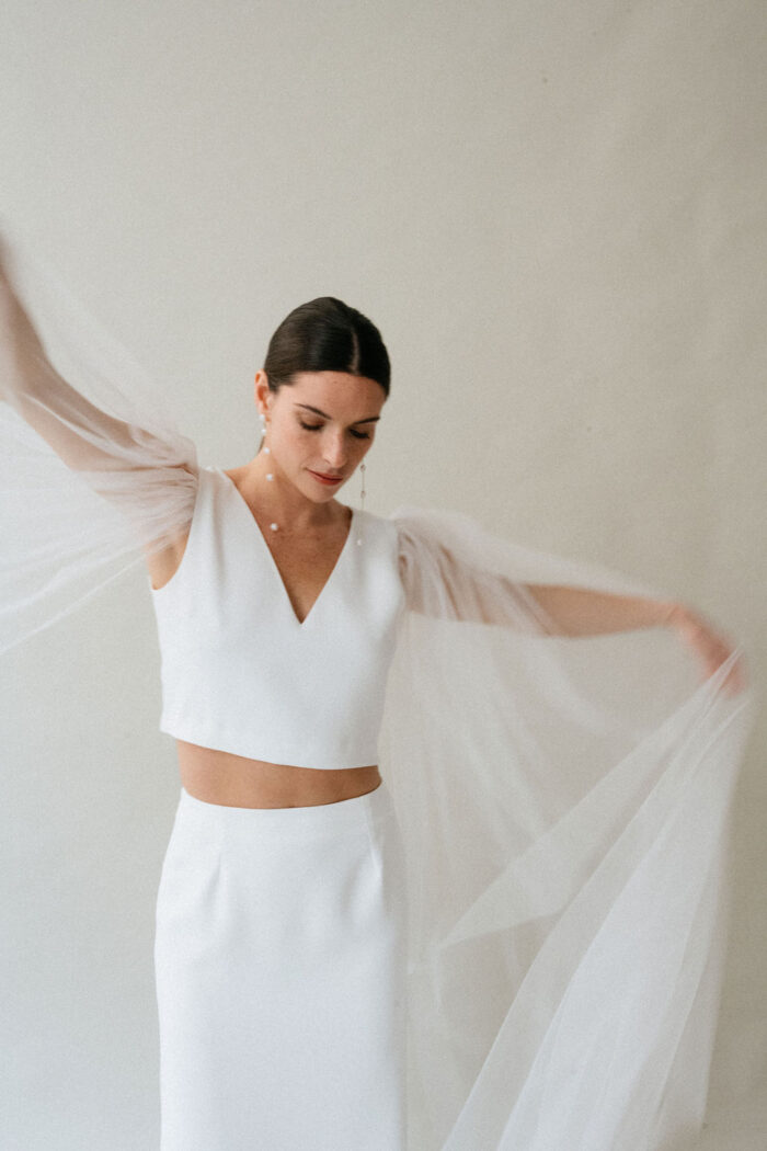 Le top PENELOPE séduit par ses manches en tulle qui peuvent être drapées façon châle ou nouées dans le dos pour un look cocktail.